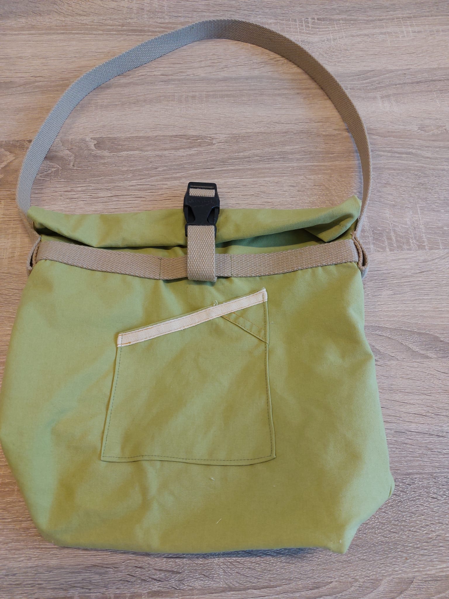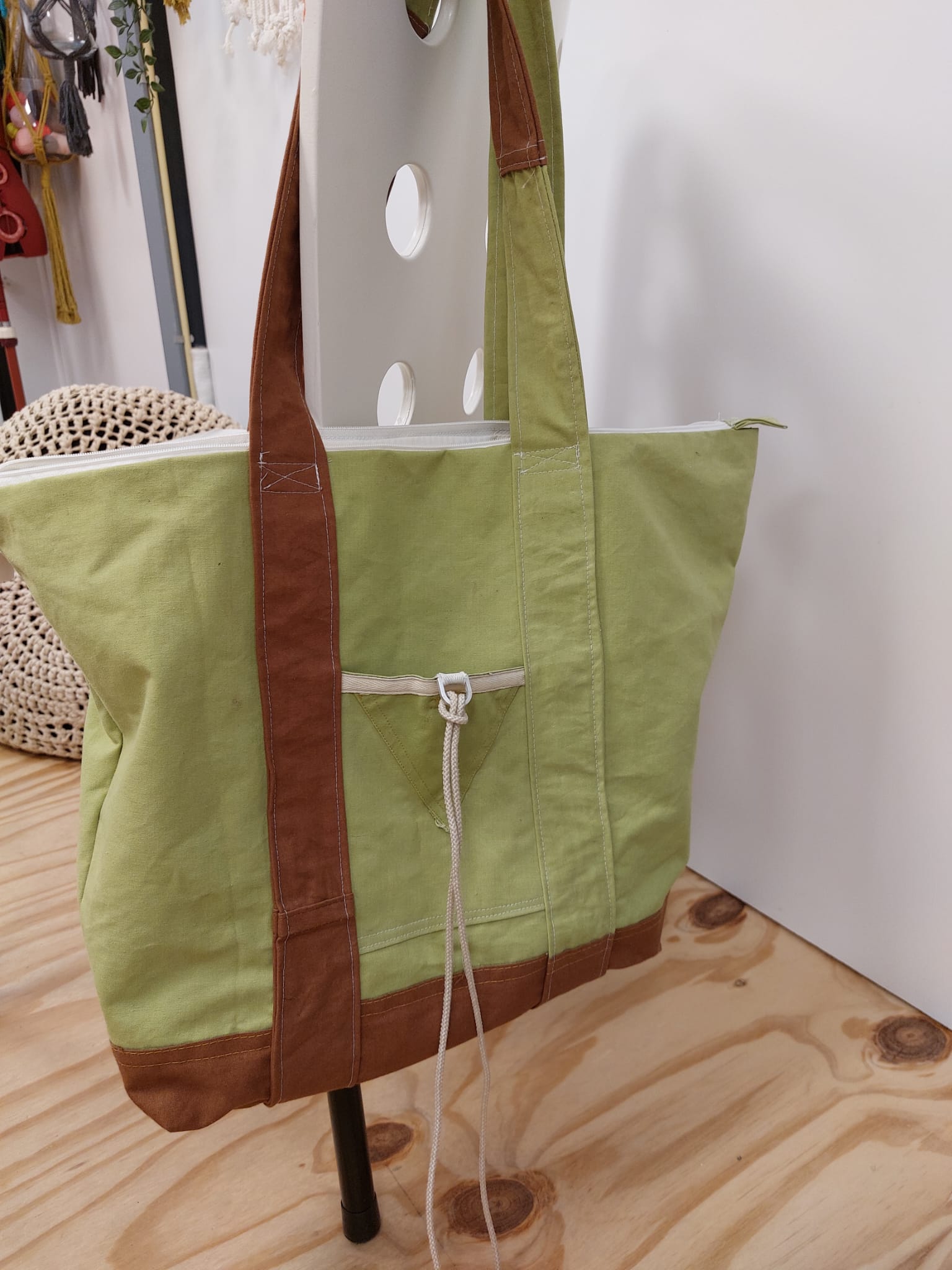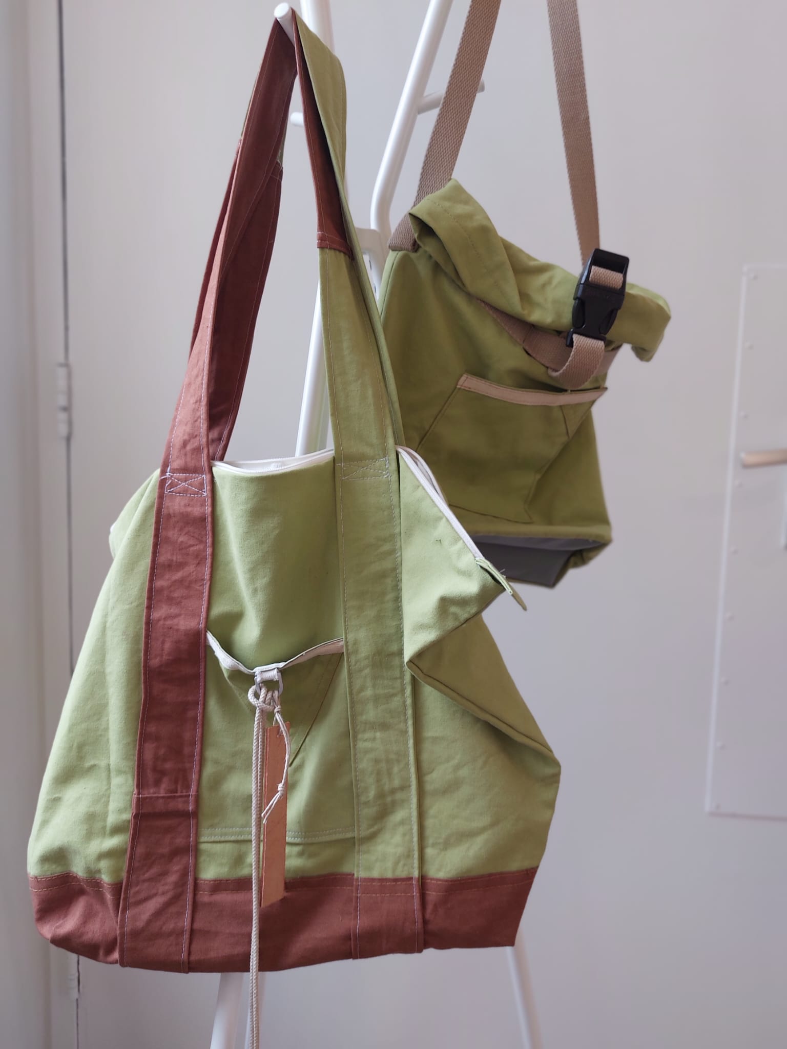 Er is keuze uit 2 modellen, een Tote bag of een Rol-up tas. Op dit moment: heb ik de volgende kleur tenten: groen met bruin en bruin.