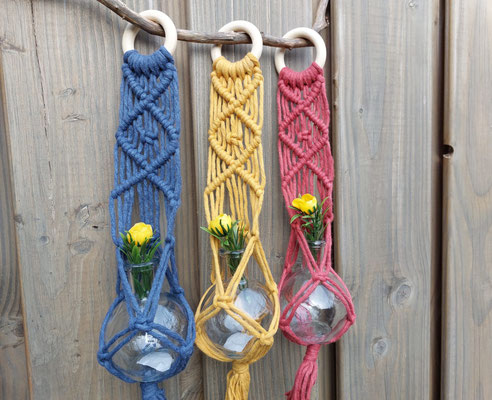 Je kunt meerder hangertjes maken, inclusief vaasje. Vul ze met vrolijke bloemetjes en hang ze aan een koord of stok en je hebt een bloemenpacht bij elkaar.