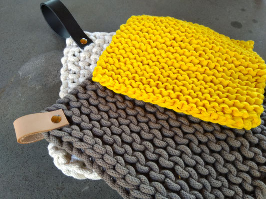 We werken met dik materiaal en dikke breinaalden . De lederen lus zet je er zo aan vast en maakt het helemaal af.